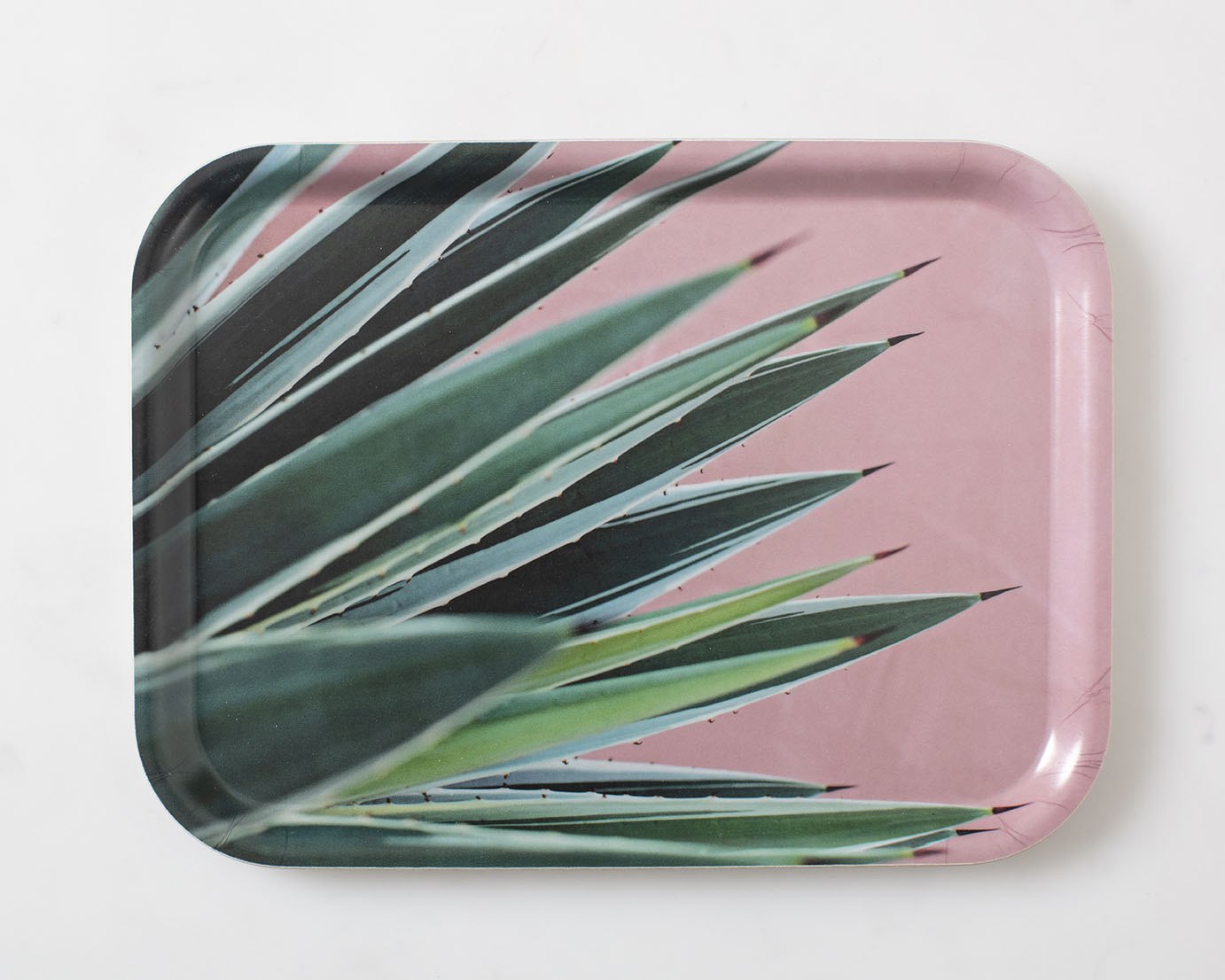 This mini tray by Meredith Andrews features a bold botanical composition set against a warm pink backdrop, with sharp green leaves cutting across the frame in a clean, modern style. The glossy, glass-like finish gives it a polished presence whether styled or in use.